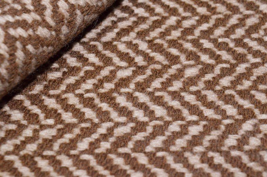 La particolarità di questo tessuto è il motivo a spina di pesce, proposto in un'originale tonalità tabacco. Rapporto spinatura 2 cm.