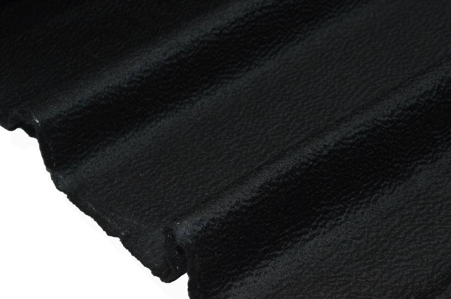 Tessuto di puro cashmere zibellinato nero, con una mano estremamente morbida e calda. La superficie soffice e lucente, caratteristica tipica di questo materiale, dona un aspetto raffinato e pregiato.