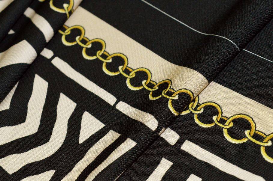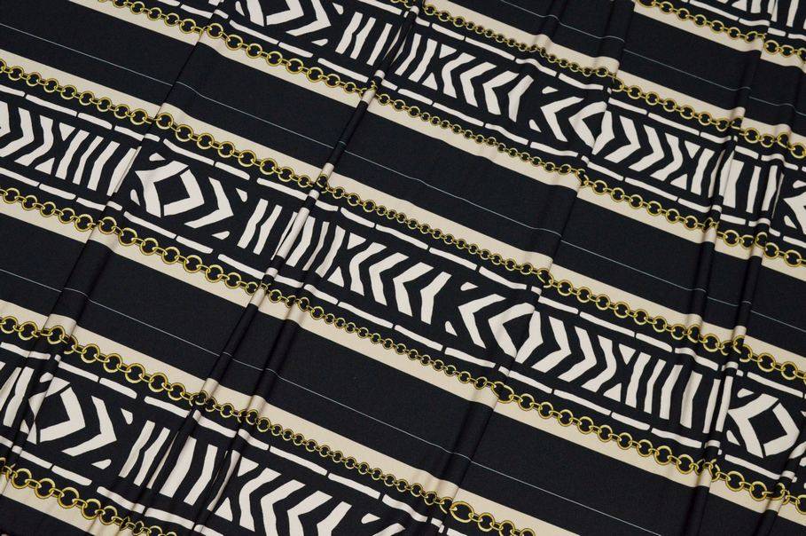 La fantasia propone una composizione elegante caratterizzata da righe orizzontali nere alternate a fasce beige di diverse dimensioni. Il design è arricchito da motivi in stile etnico e piccole catene giallo oro che percorrono il tessuto in modo perpendicolare alle righe, creando un effetto decorativo originale ed unico.