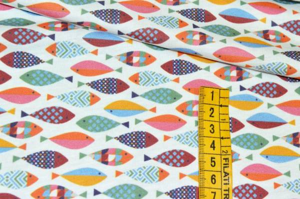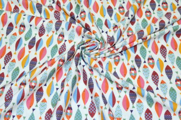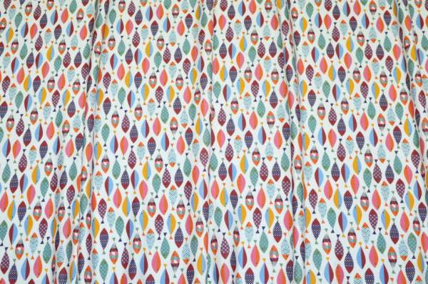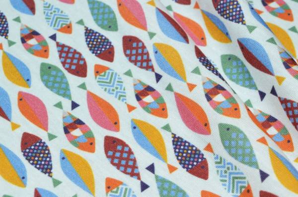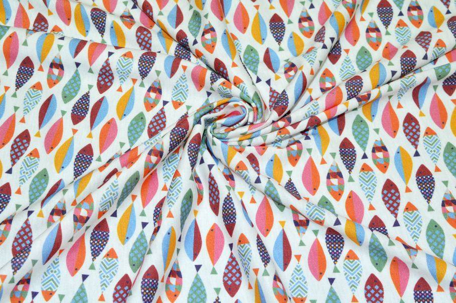 La fantasia, vivace e giovanile, presenta un fondo bianco decorato da tanti piccoli pesci colorati che donano alla stoffa un aspetto unico e giocoso.