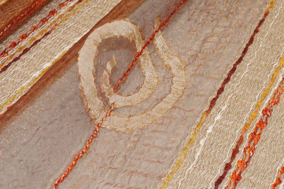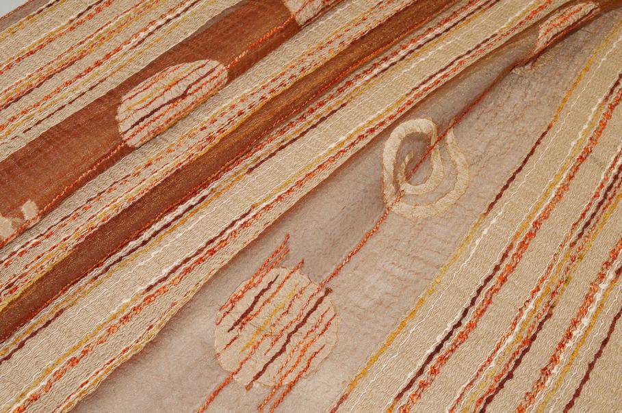Tessuto in organza leggera e luminosa, caratterizzato da una fantasia a fasce verticali che alterna bande di media coprenza a sezioni trasparenti e filtranti alla luce.