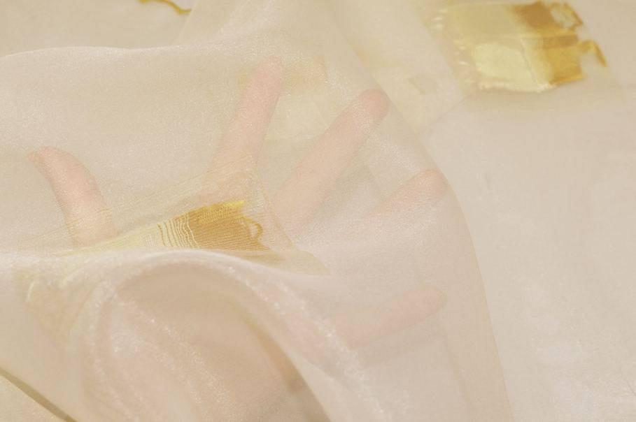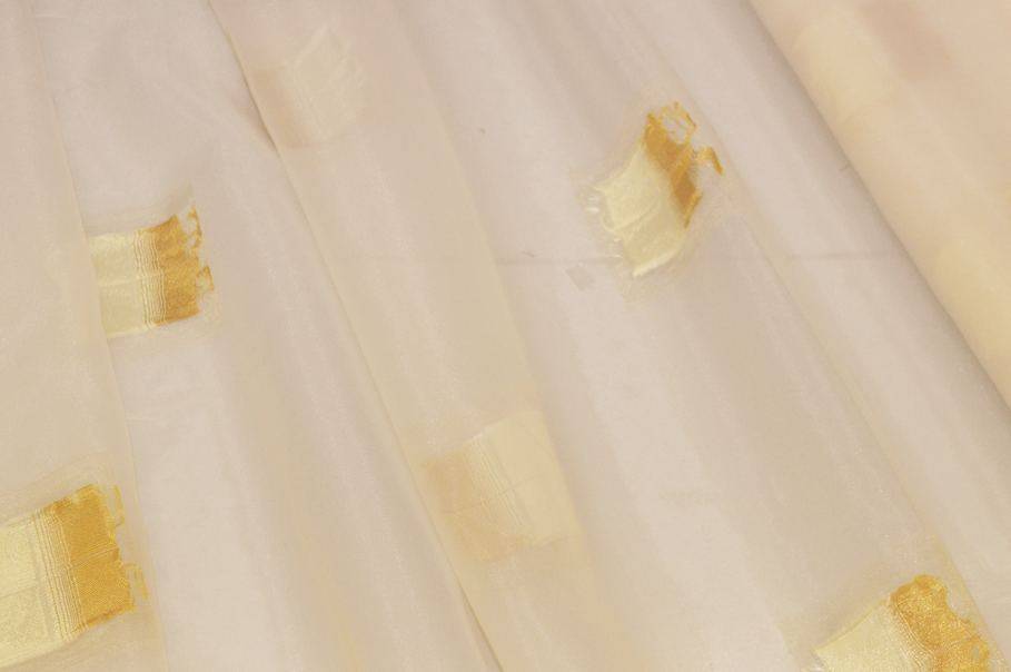 Tendino in organza leggerissima e trasparente, dal fondo giallo chiarissimo che dona luminosità e delicatezza agli ambienti. La stoffa è arricchita da applicazioni rettangolari sfumati con colorazione che varia dall'avorio all’ocra, creando un elegante effetto degradé.
