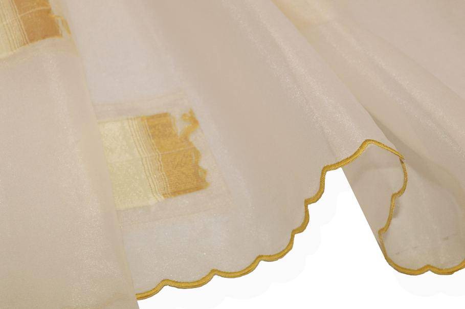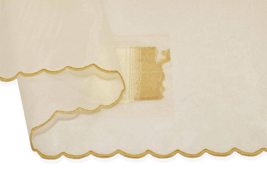 Perfetto per la realizzazione di tendini a vetro, presenta i bordi laterali già rifiniti con una smerlatura decorativa in tonalità ocra, che richiama le applicazioni del tessuto e rifinisce il tendaggio con gusto.