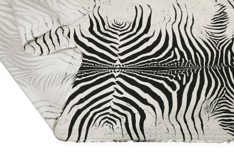 Il design presenta una fantasia animalier zebrata nei toni del nero e bianco naturale, creando un effetto grafico deciso e contemporaneo, ideale per valorizzare ogni look con un tocco distintivo.