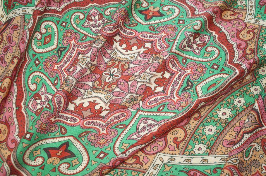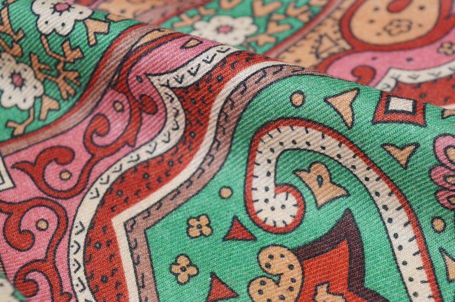 Il design propone una fantasia piazzata effetto foulard nei toni intensi e sofisticati del bruciato, fucsia e verde, creando un effetto scenografico e distintivo, perfetto per capi e accessori unici.
