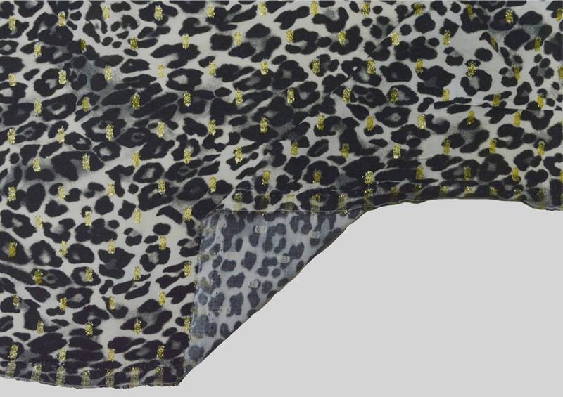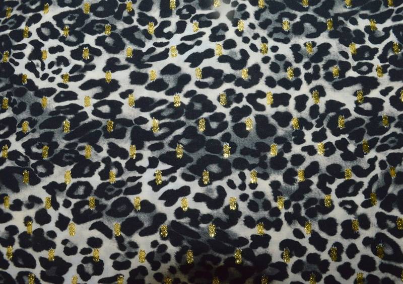 Il motivo maculato, reso ancora più prezioso da delicati ricami in filo lurex oro, conferisce alla stoffa un tocco elegante e sofisticato, perfetto per chi desidera capi dal carattere deciso ma allo stesso tempo femminile.