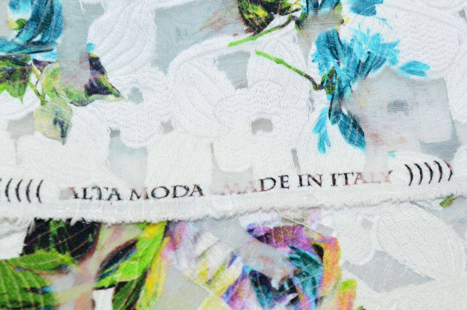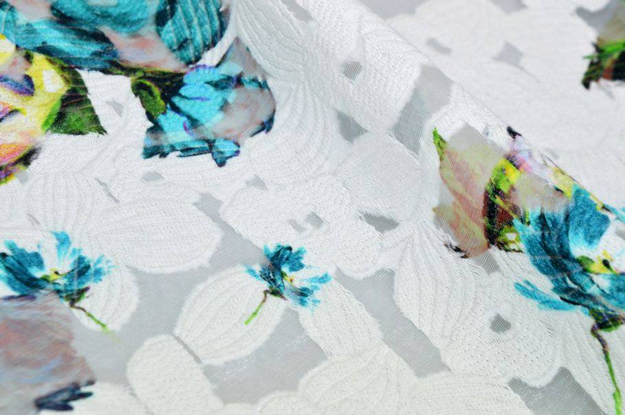L’effetto devoré è dato dalla base in organza bianca a tinta unita, che lascia intravedere la leggerezza del fondo, mentre le parti coprenti presentano una raffinata lavorazione arricchita dalla stampa floreale azzurra.