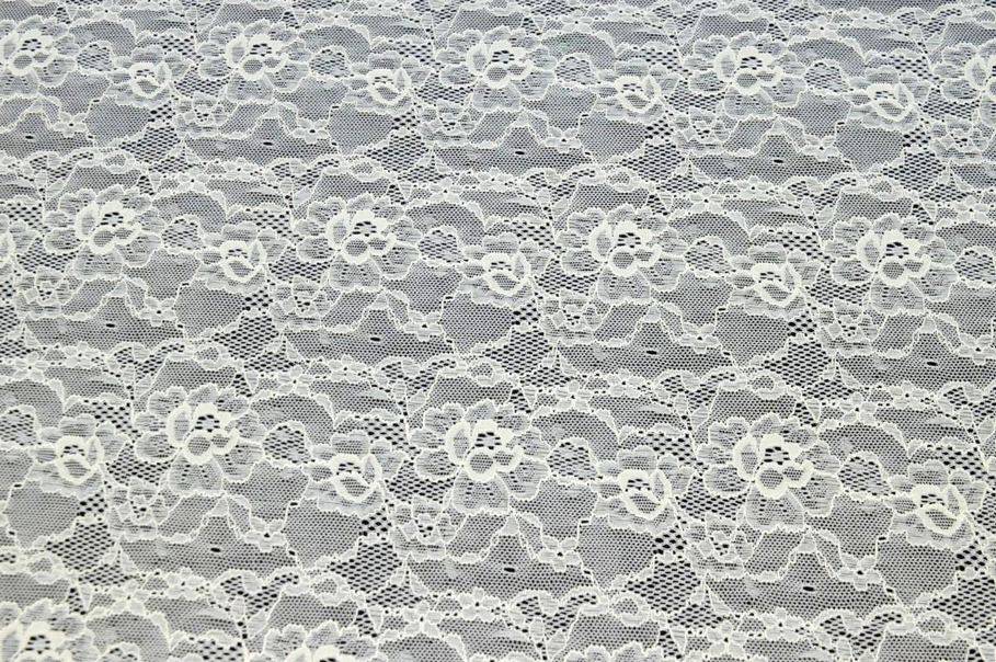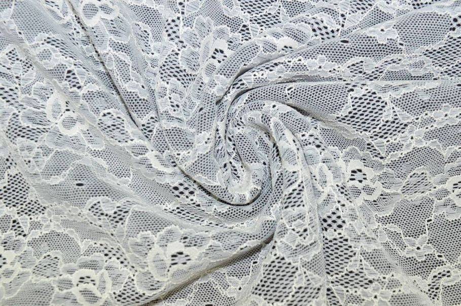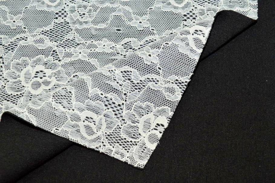 Tessuto in jersey con lavorazione in pizzo a campo pieno. Il fondo in jersey nero, visibile sul rovescio, è arricchito sul dritto da un raffinato pizzo applicato sopra color bianco naturale (non ottico né tendente al panna/giallo), che dona al tessuto un aspetto elegante e molto fine.