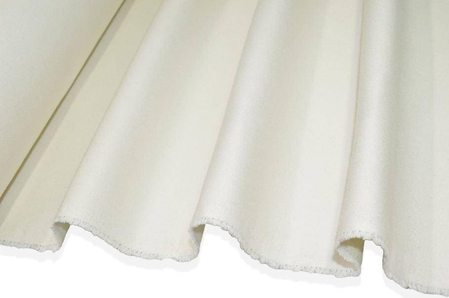 Tessuto double in pura lana colore panna, dalla mano calda, avvolgente e morbida. La struttura double nasce dall’unione di due strati di tessuto, facilmente divisibili come mostrato nella foto dimostrativa.
