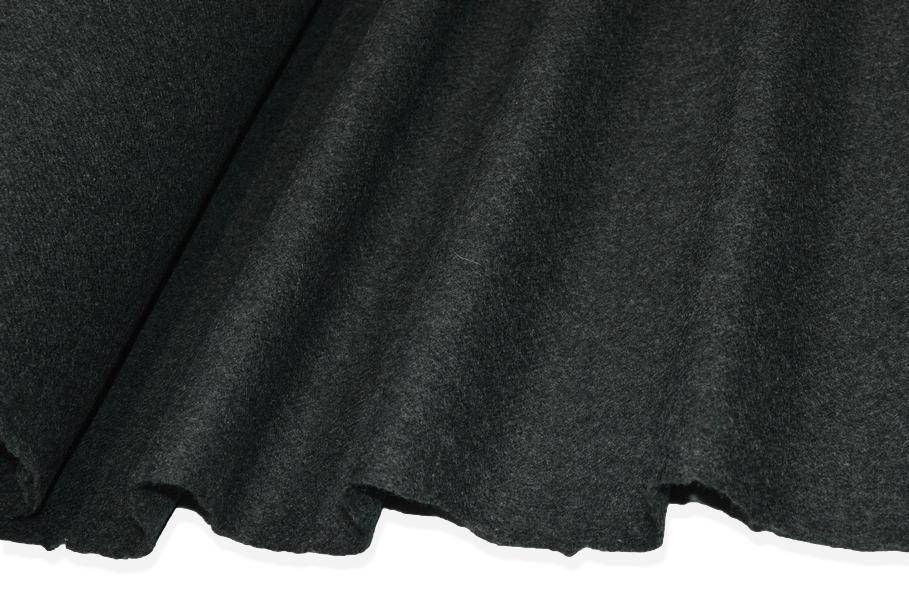 Panno da cappotto in pura lana in elegante tonalità grigio antracite, caratterizzato da una mano compatta e una struttura sostenuta. Ideale per la confezione di capispalla autunno/inverno, come cappotti classici e doppiopetto, cappotti modello montgomery e giacconi pesanti da uomo e da donna.
