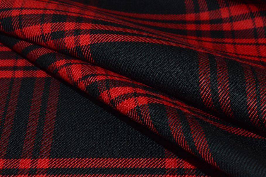 Tessuto in pura lana caratterizzato dall'iconica quadrettatura tartan nei toni del rosso e del nero. La superficie è morbida e piacevole al tatto, con una mano compatta e leggermente elastica che garantisce comfort durante l'indosso dei capi realizzati con questa stoffa.