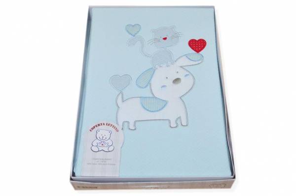 COPERTA LETTINO IN JERSEY DOPPIATO PURO COTONE DISEGNO CANE E GATTO AZZURRO
