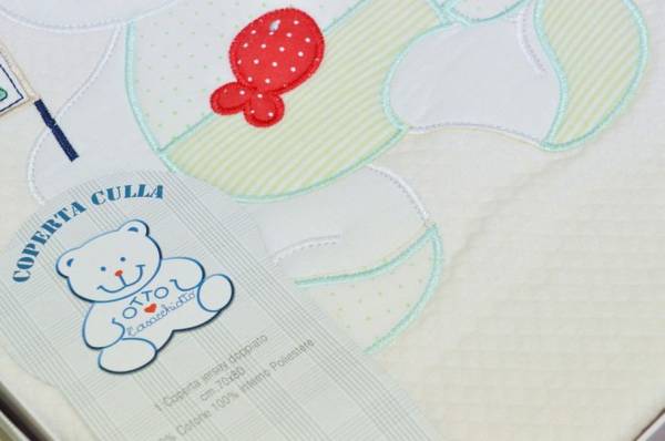 Composizione tessuto esterno 100%cotone, imbottitura 100%poliestere. Misura coperta 70x80 cm.