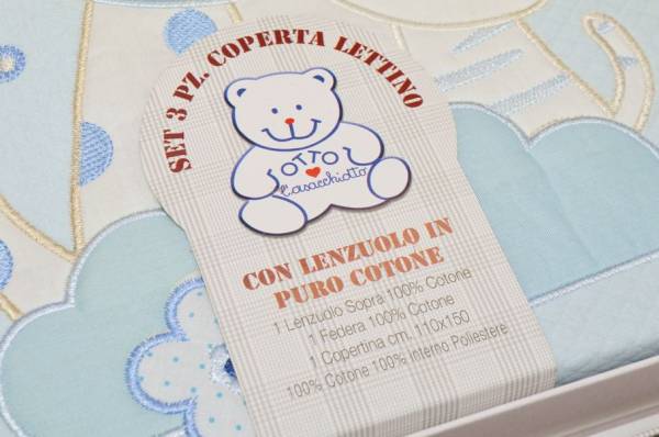 Composizione 100%cotone. Misura lenzuolo sopra cm 155x115, misura federa cm 51x37. Composizione coperta 100%cotone, imbottitura 100%poliestere. Misura coperta cm 70x80.