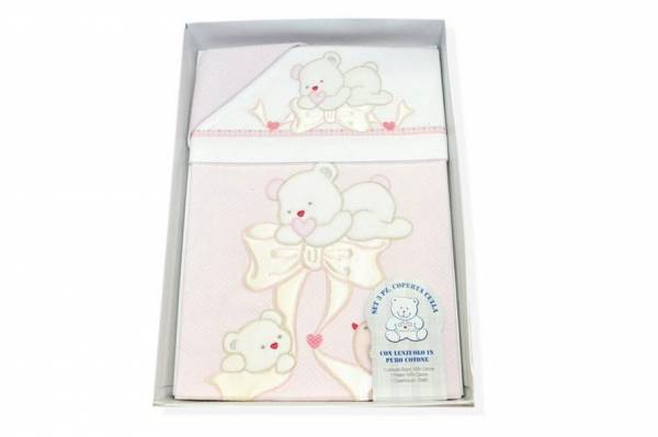SET 3 PEZZI COPERTA CULLA DISEGNO FIOCCO ROSA