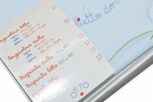 Composizione tessuto 100%cotone. Misura lenzuolo superiore cm 80x120, lenzuolo sotto cm 40x70 con angoli cm 8, federa cm 28x37 con pattina da 8 cm.