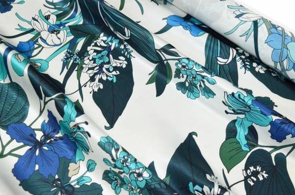 Il fondo presenta una particolare fantasia floreale celeste/blu.