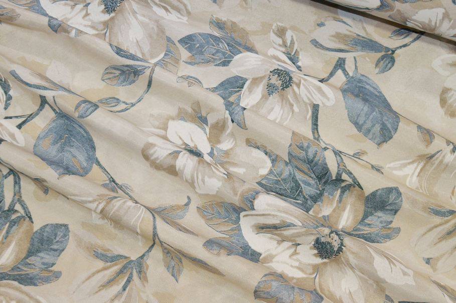 Vendita online cotoni tessuto arredo fantasia magnolia azzurra fondo beige - Tessuti & Stoffe