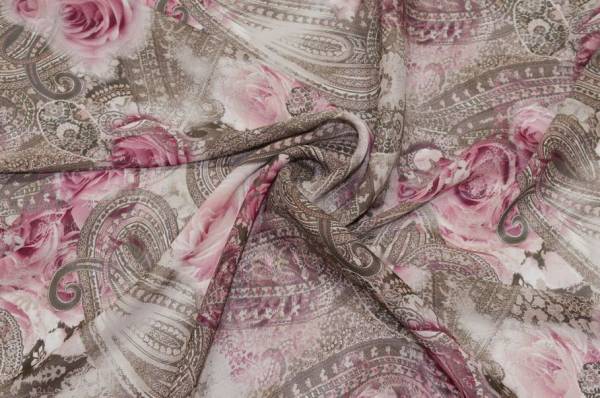 Ideale per camicie raffinate, abiti leggeri e stole coprispalla, questo tessuto si distingue per il suo design originale dove l’iconico motivo cashmere viene impreziosito da un delicato fiore rosa, che aggiunge una nota romantica in perfetto equilibrio tra eleganza classica e stile contemporaneo.