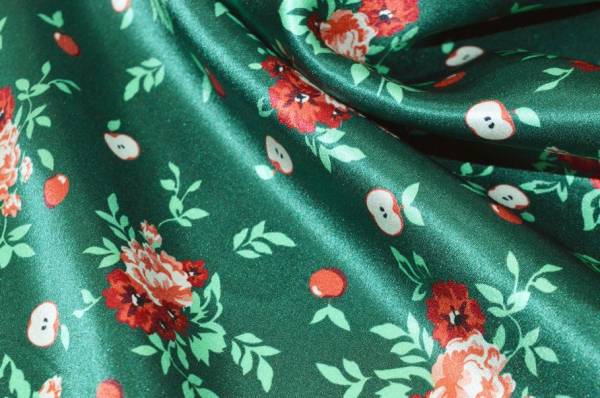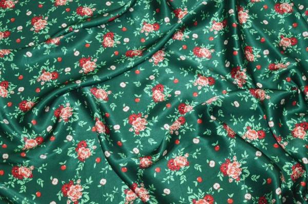 Raffinato raso di pura seta molto apprezzato per la sua superficie liscia e luminosa e per la mano morbida e scivolata che accarezza delicatamente la pelle. La fantasia viene posizionata su un elegante fondo verde smeraldo che enfatizza con un accattivante contrasto le nuance rosse dei piccoli fiori, un motivo fresco e originale che unisce grazia e personalità.