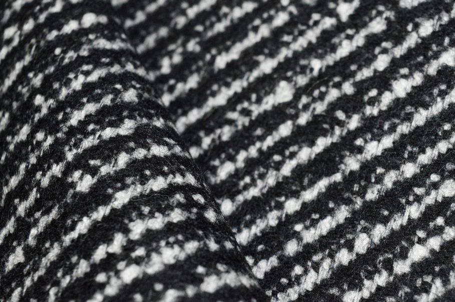 Questo articolo presenta due facce distintive: da un lato una particolare fantasia a diagonale nei toni del bianco e nero, dall’altro una particolarissima gradazione verde marcio/sottobosco. Una combinazione che apre a infinite possibilità creative, perfetta per confezionare cappotti e soprabiti con dettagli a contrasto o giochi di colore.