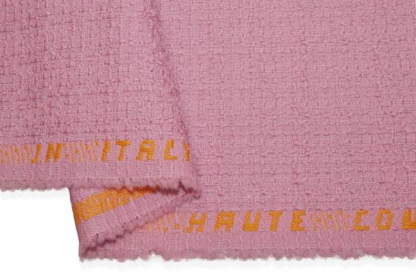 Tessuto Chanel 100% Made in Italy realizzato interamente in pura lana, caratterizzato dalla tipica trama distintiva di questa tipologia di tessuto, con intreccio dei filati ben visibile e in rilievo, per un effetto movimentato, irregolare e leggermente granuloso.
