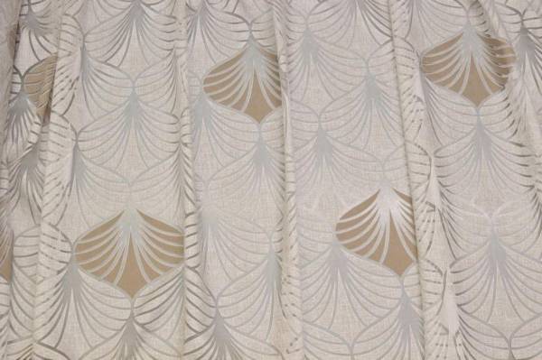 Il fondo presenta una delicata colorazione tortora/beige impreziosita da alcuni punti color beige distribuiti sulla stoffa che completano l'elegante disegno. Indicato principalmente per realizzare tende arricciate di ogni tipologia. Piombato sul fondo.