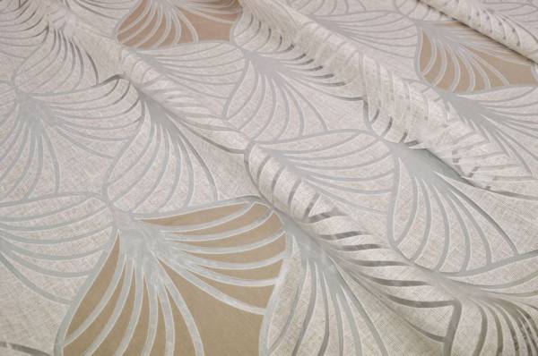 Il fondo presenta una bellissima fantasia raffigurante foglie stilizzate che mostrano dettagli trasparenti e coprenti per un effetto vedo non vedo, tipico delle stoffe in devoreh. Questa lavorazione consente alla luce naturale di filtrare facilmente illuminando gli spazi con scarsa luminosità, mantenendo un'adeguata privacy nell'ambiente che si vuole arredare.