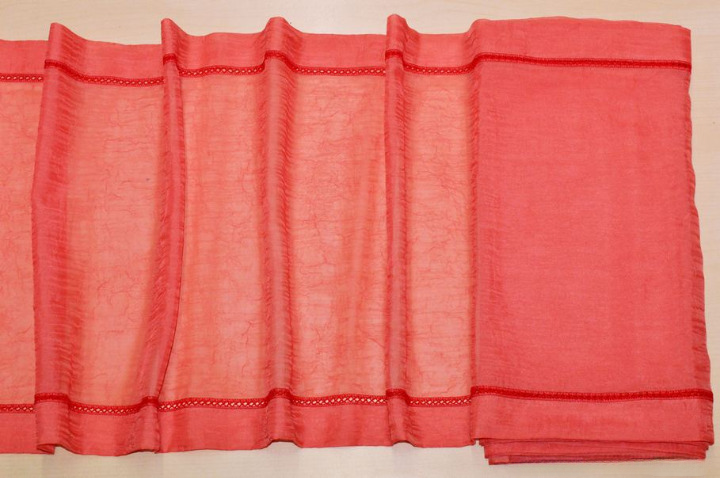Tendino in velo stropicciato color corallo, venduto a metraggio. Il tessuto è rifinito sui lati, quindi il taglio va effettuato nella parte superiore e inferiore, per una confezione ordinata e pronta da montare.