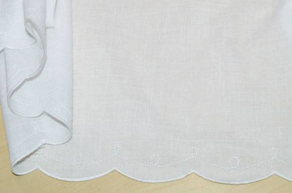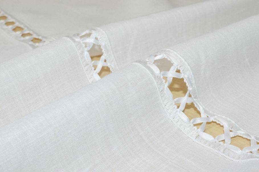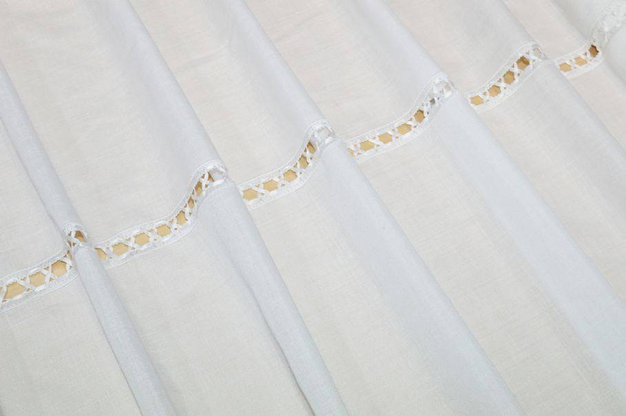 Tessuto tenda bianco in tessuto leggero e luminoso, decorato con incasso in nastrino di raso alto 3 cm che dona eleganza e delicatezza. La distanza tra l’incasso e il merletto finale è di 38 cm, creando un equilibrio armonioso tra parte liscia e decorazione.