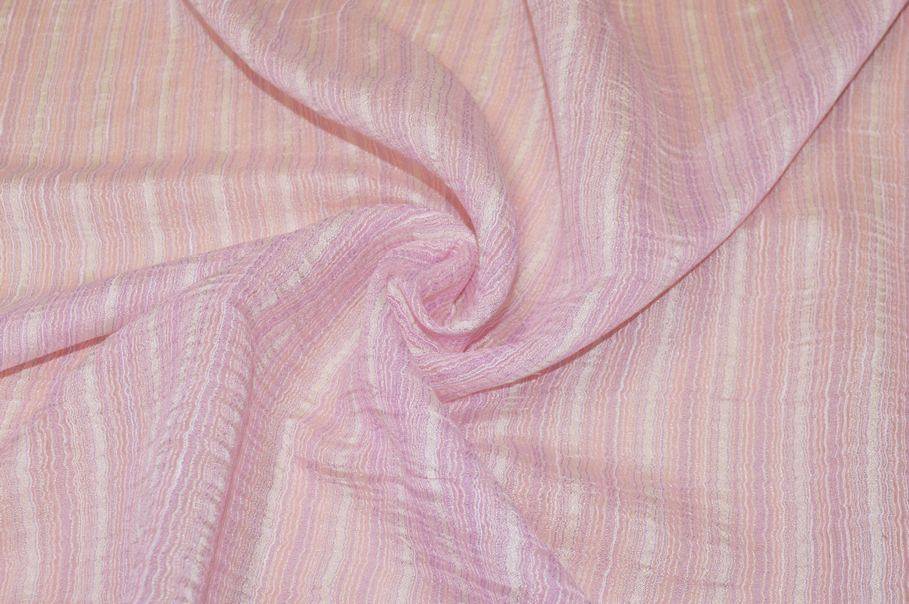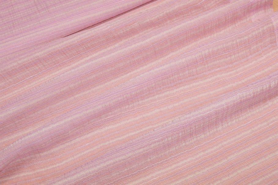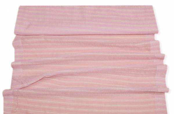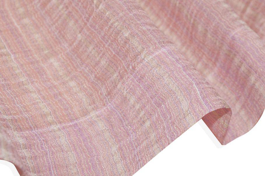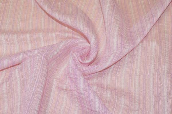 Tendino effetto stropicciato con giocosa fantasia composta da righine irregolari di diverse tonalità di rosa. Il tessuto presenta inoltre un effetto stropicciato donando movimento alla stoffa. La banda laterale misura 5 cm.
