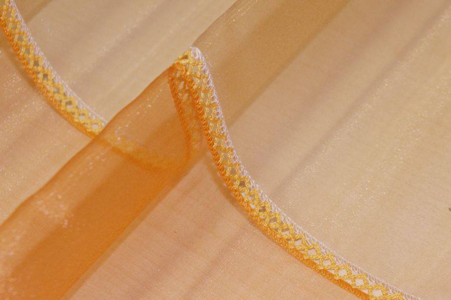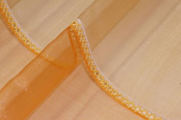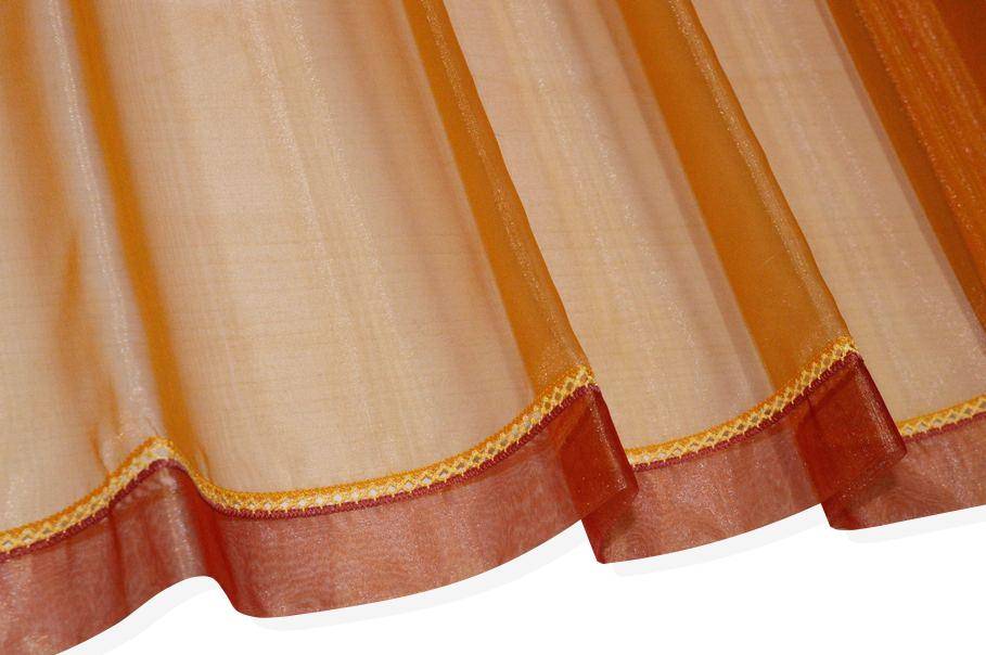 Tendino in organza leggerissima e trasparente, dall’aspetto arioso e luminoso. Il tessuto è diviso da un inserto centrale ricamato che separa la tenda in due sezioni: una color arancio e l'altra nei toni del giallo chiaro. Le due tonalità si mescolano leggermente, creando un elegante effetto cangiante e riflessi che richiamano l’una il colore dell’altra.