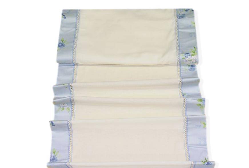 Tendino con fondo bianco di media coprenza, ma di mano leggera, arricchito da un delicato bordo floreale azzurro che misura 6,5 cm.