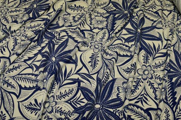 Tessuto in pura viscosa dalla mano morbida, fresca e cadente. La base panna è valorizzata da una fantasia floreale nei toni dell’azzurro. Ideale per realizzare capi primavera/estate come camicette, abitini leggeri sia corti che lunghi che mettono in risalto la fantasia, gonne e top.