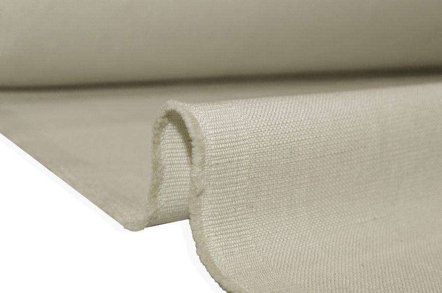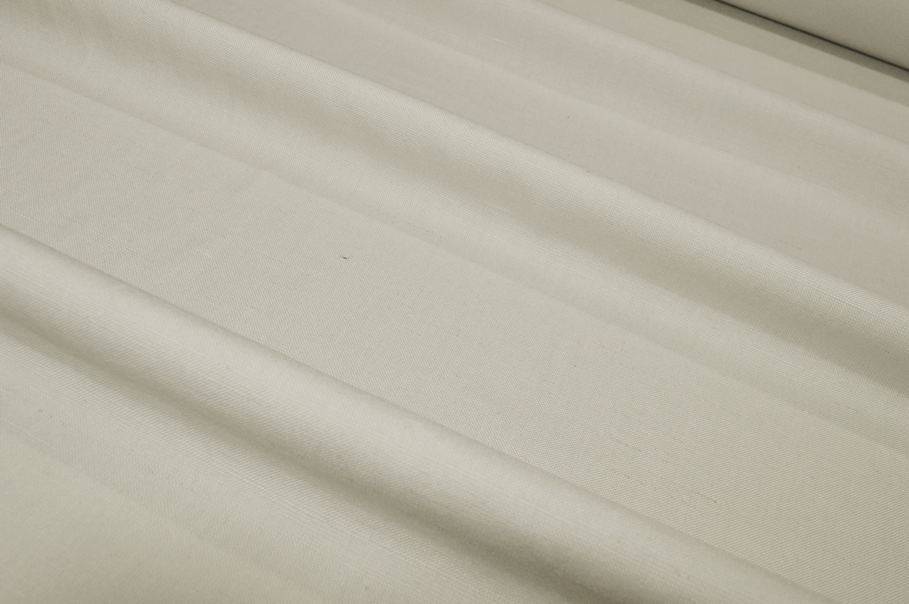 Tessuto in misto lino color sabbia, dalla mano piacevolmente fresca, morbida e liscia.