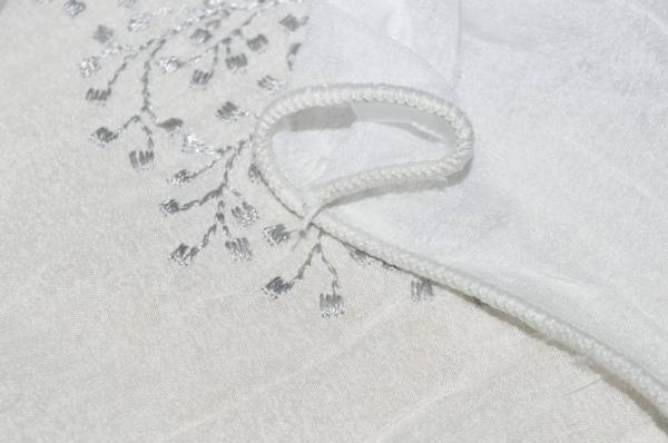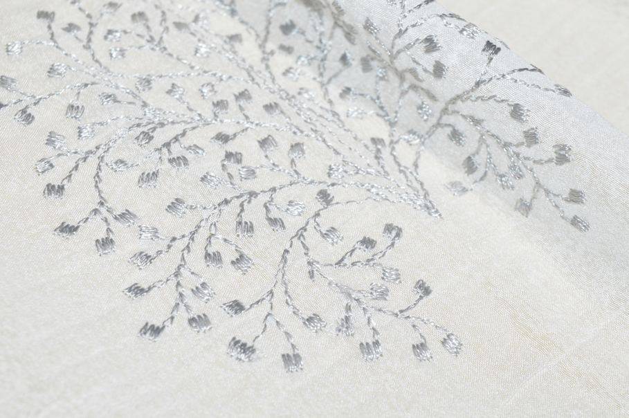 La base viene arricchita da un minuzioso e fine ricamo grigio che riproduce l’Albero della Vita stilizzato, elegante e decorativo.