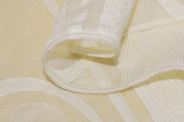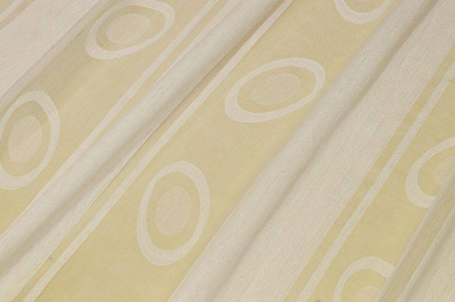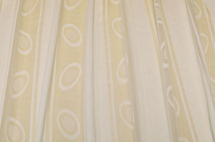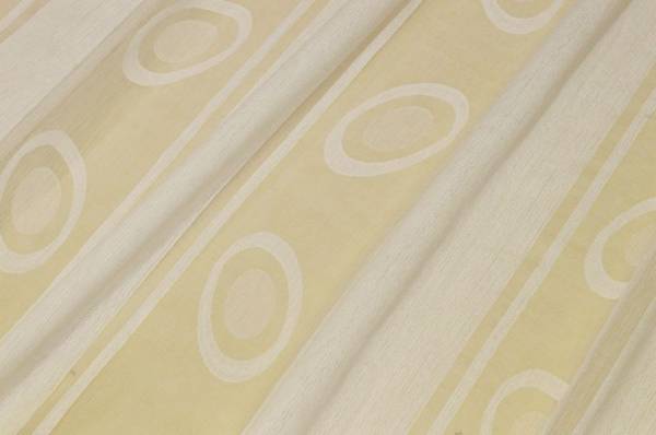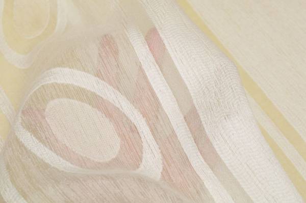 Tessuto per tende in organza colore avorio, semitrasparente e leggero, dalla caduta morbida ed elegante. La superficie è impreziosita da un delicato motivo a cerchi che dona movimento e un raffinato effetto decorativo, filtrando la luce in modo soffuso e armonioso.