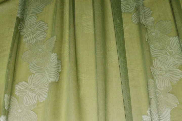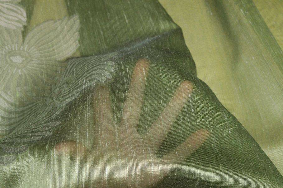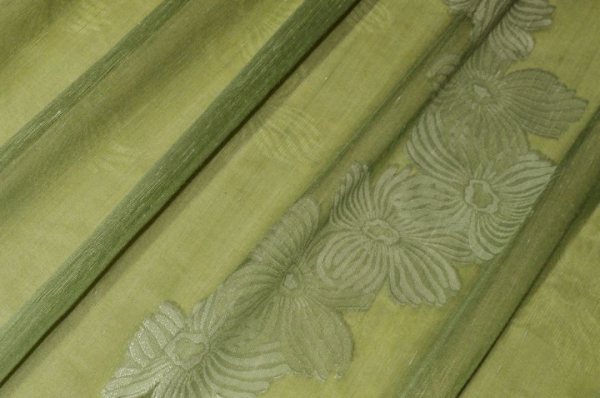 Tessuto per tende con ricamo fill coupé floreale verde, elegante e decorativo, arricchito da un raffinato motivo botanico che dona freschezza e personalità all’ambiente. Il disegno floreale, realizzato con tecnica fill coupé, crea un armonioso gioco di pieni e trasparenze, esaltando la leggerezza del tessuto.