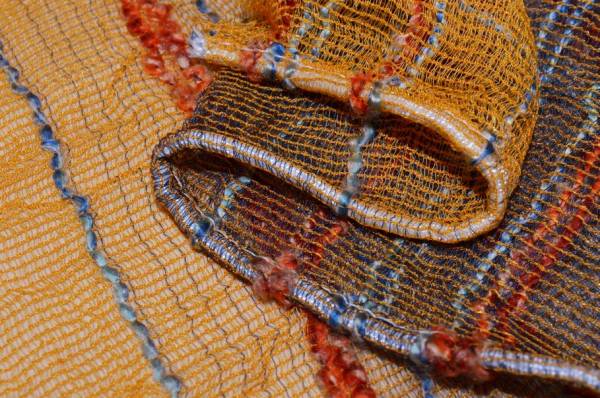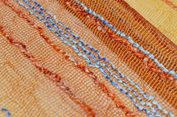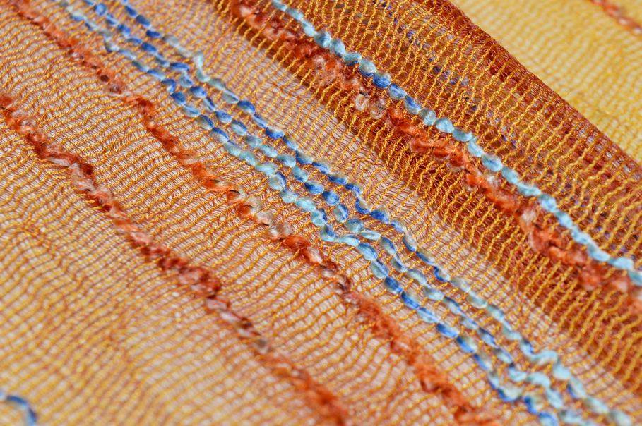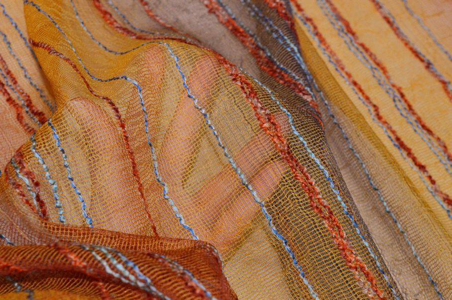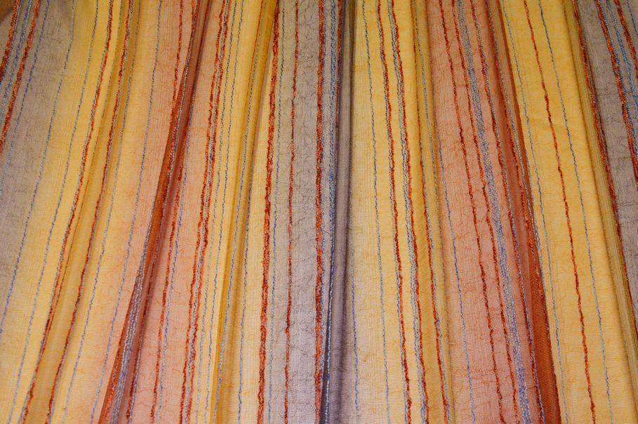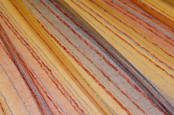 Tessuto per tende in retina arancio dalla trama leggera e ariosa, arricchita da una righina in rilievo dai delicati colori azzurro e arancio che crea un raffinato effetto decorativo.