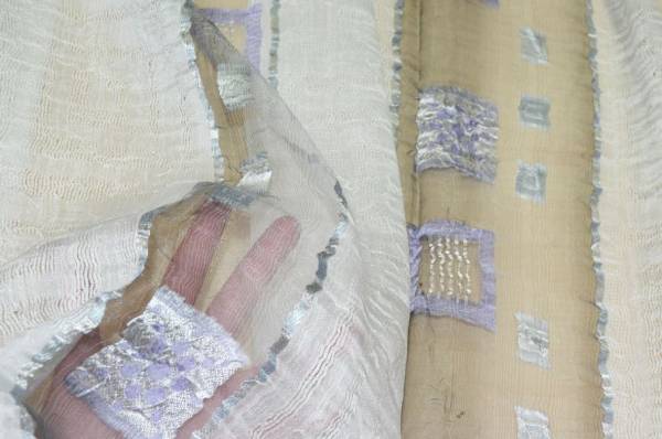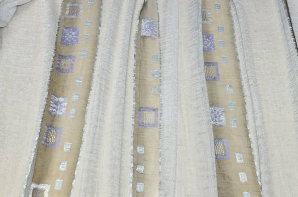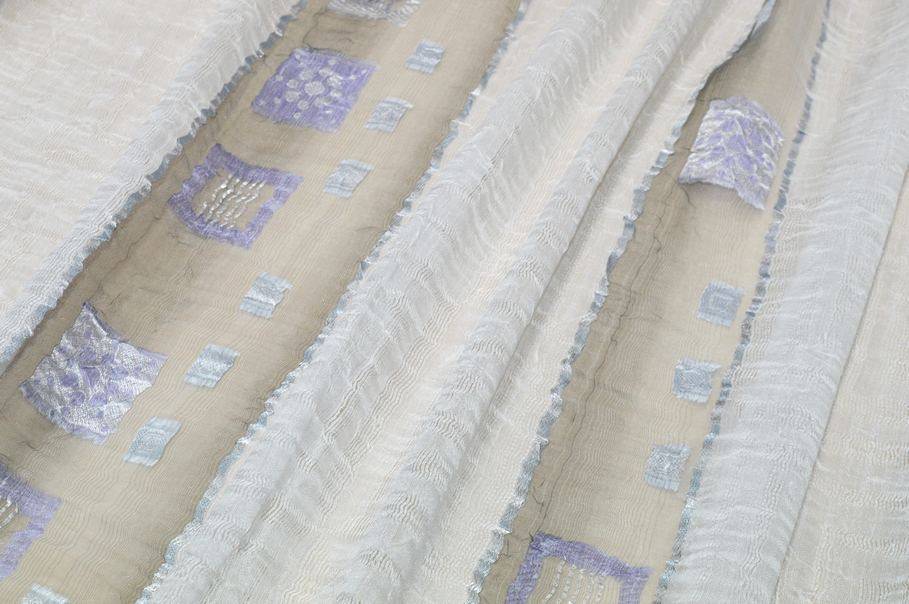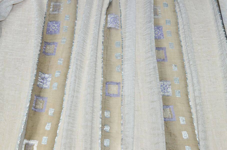 Tessuto per tende in organza misto lino 100%Made in Italy con ricamo fill coupé lilla, elegante e leggero. Il ricamo lilla, realizzato con tecnica fill coupé, aggiunge un delicato motivo decorativo, conferendo stile e raffinatezza al tessuto.