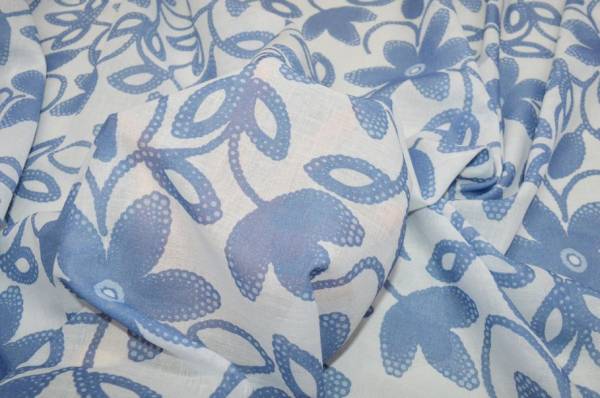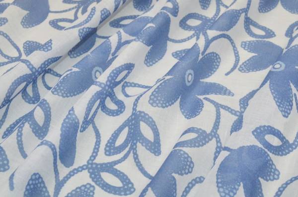 Il tessuto presenta una leggera trasparenza e una struttura molto leggera che lo rende particolarmente adatto alla camiceria. La fantasia nei toni del bianco e dell’azzurro dona un aspetto fresco ed elegante.