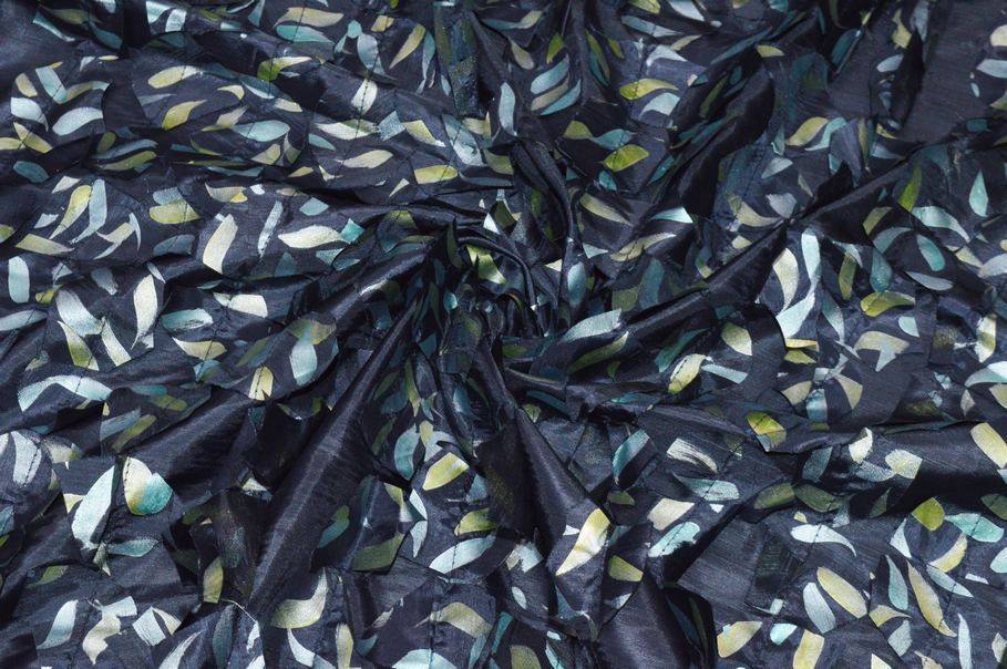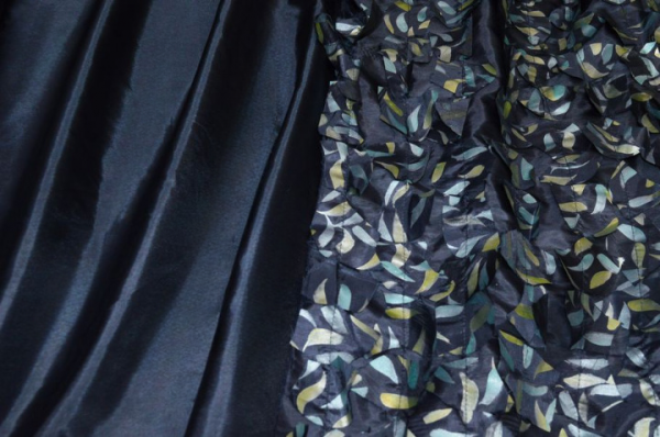 Il secondo tessuto, con lo stesso fondo, presenta una lavorazione in rilievo con applicazioni cucite, che creano un effetto tridimensionale originale e dinamico.