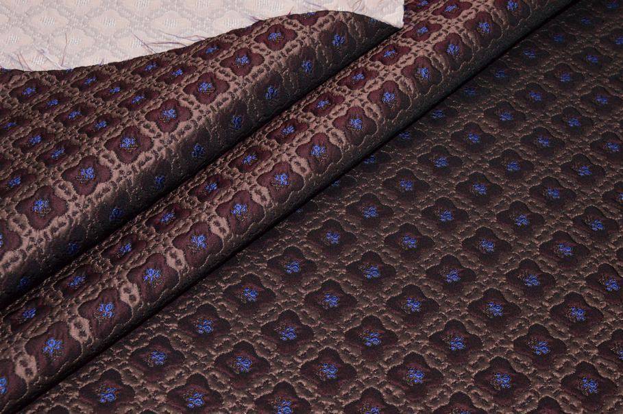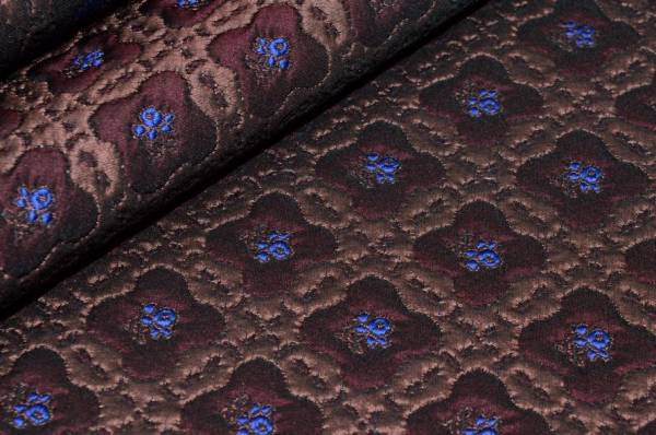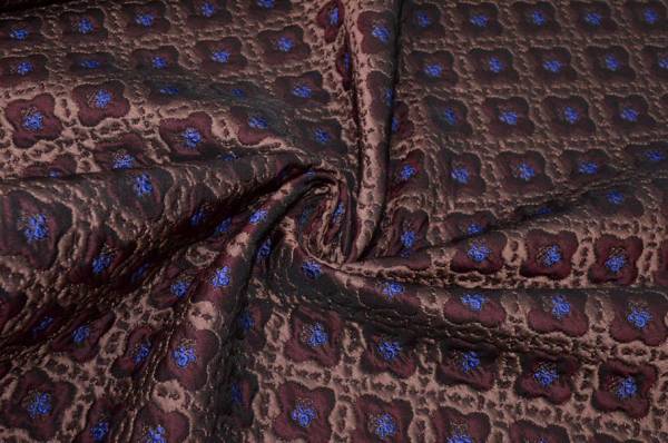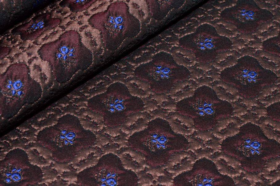 Tessuto broccato con fantasia di piccoli fiorellini, caratterizzato da una mano corposa e sostenuta che conferisce struttura al capo. Il prodotto risulta ugualmente piacevole al tatto pur mantenendo compattezza e consistenza.