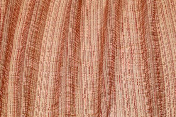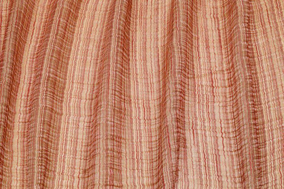 Tessuto in organza con effetto stropicciato che dona alla superficie le tipiche increspature irregolari di questa lavorazione. Il tessuto nasce per la confezione di tendaggi, in particolare di tende arricciate, dall’aspetto leggero, cadente e trasparente.