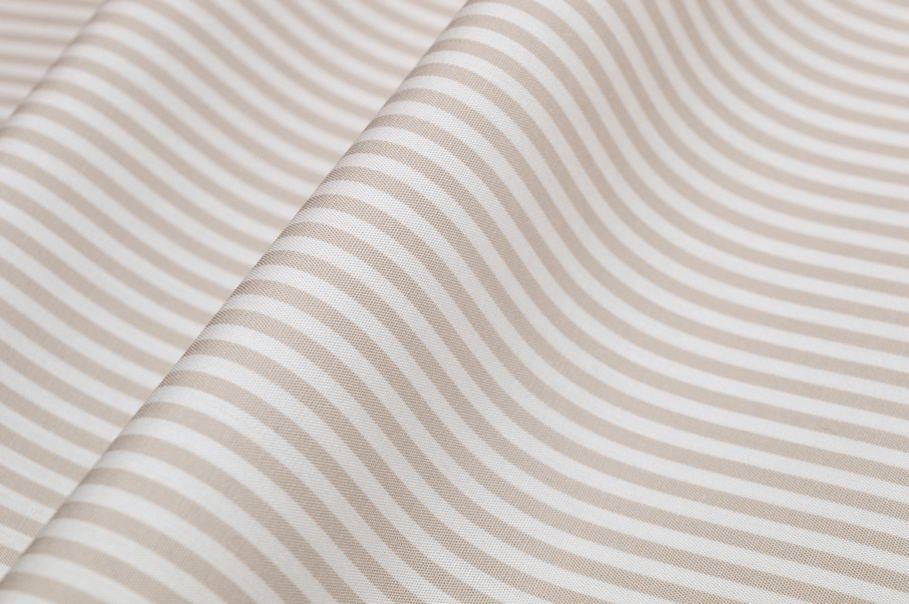 Tessuto in puro cotone da camiceria di ottima qualità, caratterizzato da una fantasia a righina beige da 2 mm. La stoffa presenta una trama liscia e compatta, pur mantenendo però la mano leggera, morbida al tatto e traspirante, qualità che garantiscono comfort e freschezza durante l’indosso.