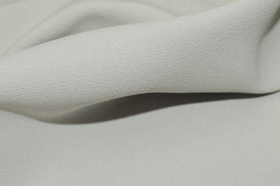 Tessuto crêpe cady stretch color grigio perla, caratterizzato da una superficie con mano crêpe, morbida e cadente al tatto. La leggera elasticità della trama contribuisce a una vestibilità comoda mantenendo una buona stabilità del capo.