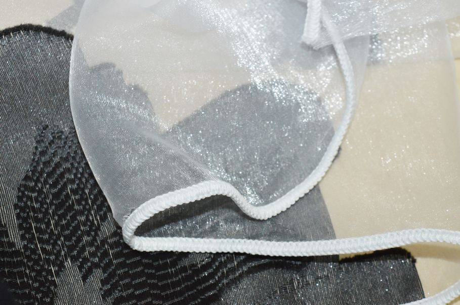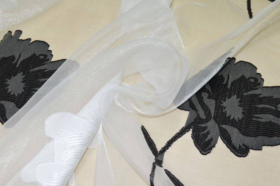 Tessuto per tende in organza bianca, leggerissima e trasparente, caratterizzato da un elegante ricamo a maxi fiore in bianco e nero alternati, che crea un grande impatto visivo e un effetto sofisticato.