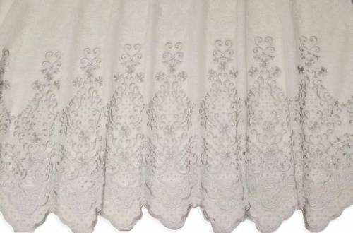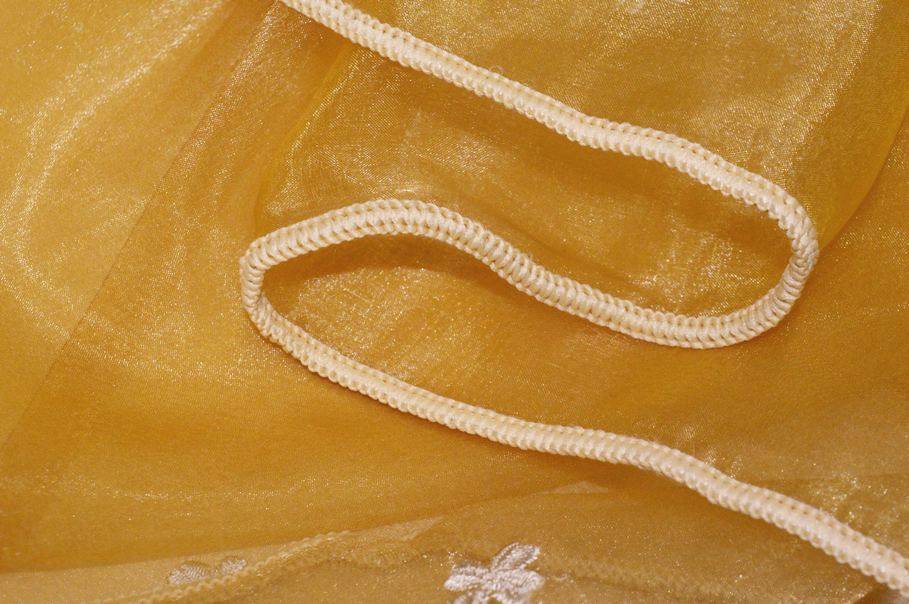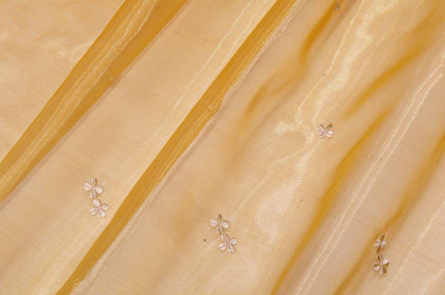 Tessuto in organza leggero, morbido e molto trasparente, perfetto per la realizzazione di tende arricciate di qualsiasi tipologia. Il fondo oro viene decorato da piccoli fiori avorio ricamati di circa 2 cm ciascuno.