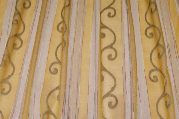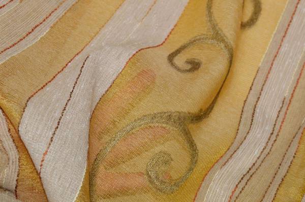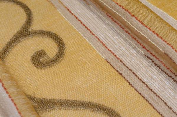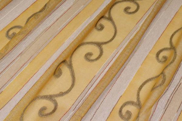 Tessuto per tende dalla mano leggera e cadente, ideale per arredamenti dal gusto classico. La sua trama particolare alterna fasce con effetto organza in una raffinata colorazione dorata a bande con trama lieve che ricorda il lino, creando un elegante contrasto di texture e trasparenze.