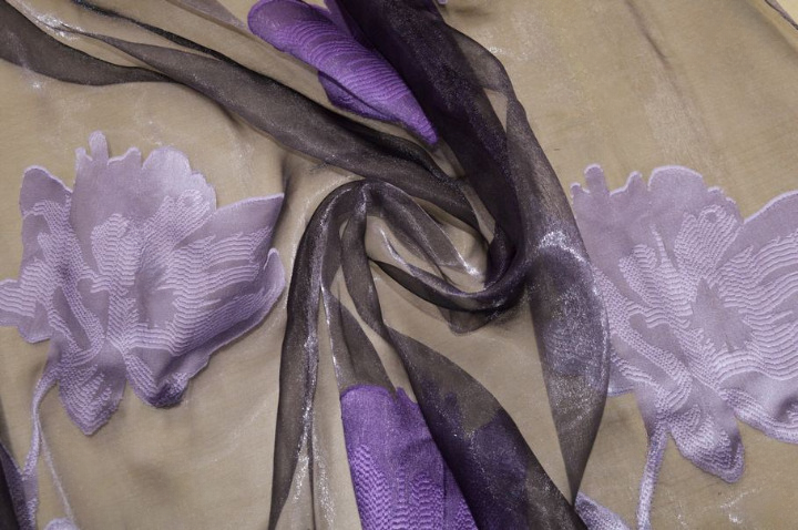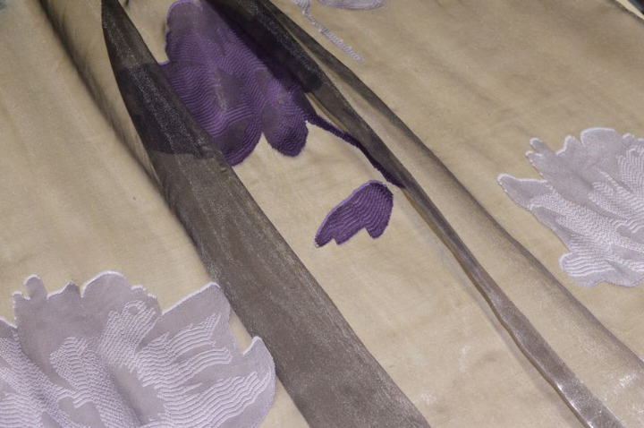 Tessuto per tende in organza, leggerissimo e trasparente, caratterizzato da un elegante ricamo a maxi fiore nelle tonalità del viola, che dona profondità e un forte impatto visivo, creando un effetto raffinato e contemporaneo.
